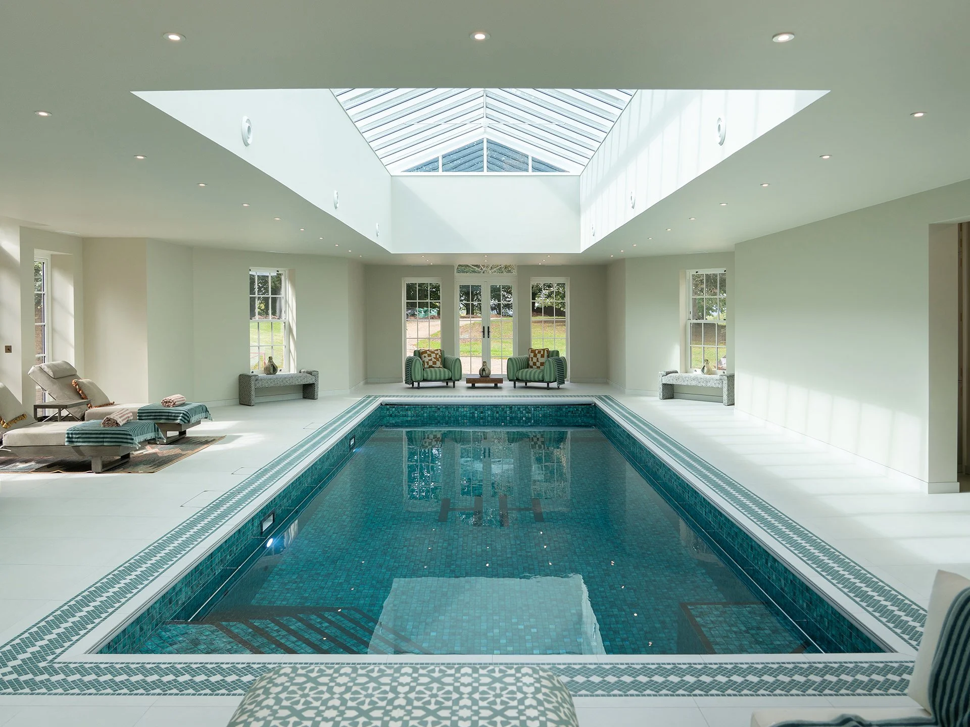 To improve safety and convenience, we designed the pool with square corners to integrate an automated safety cover, offering peace of mind while maintaining a sleek finish. Both the pool and the air are heated via a ground source heat pump, delivering energy efficiency and sustainability.